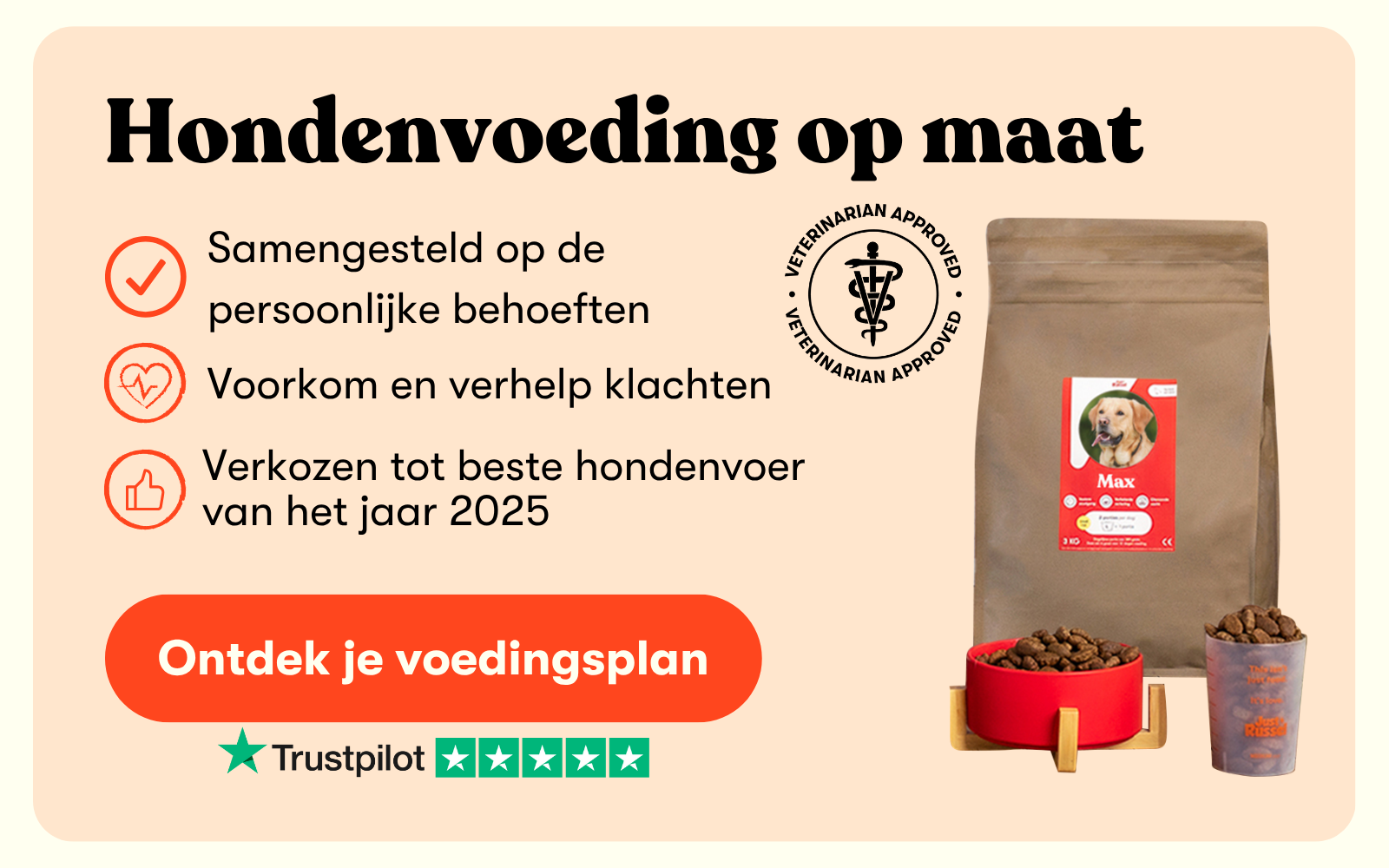 Daarom is het belangrijk om brokjes, snacks en natte voeding te kiezen die past bij de individuele behoeften van jouw hond. Just Russel biedt hypoallergene, op maat gemaakte hondenvoeding, afgestemd op het ras, gewicht, leeftijd en eventuele gevoeligheden van je hond. Zo ondersteun je niet alleen de spijsvertering, maar verklein je ook de kans op jeuk, ontstekingen én scooten.